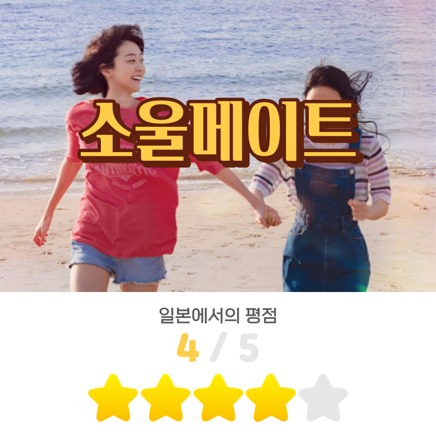 일본에서도 한국 제목 그대로 '소울메이트'라는 제목으로 개봉했습니다. 아직 개봉한 지 일주일이 채 안 되었는데 일본인들의 이 영화에 대한 평점은 5점 만점에 4점입니다. 꽤 점수가 높습니다! <소울메이트>는 홍콩의 증국상 감독이 만든 <안녕, 나의 소울메이트>(2016)를 한국의 제주도로 무대를 옮겨 새롭게 영화로 만든 리메이크 작품입니다. 어릴 때부터 둘도 없는 절친한 친구였던 두 소녀의 엇갈림과 유대감을 애틋하면서도 따뜻하게 그린 우정 이야기입니다.